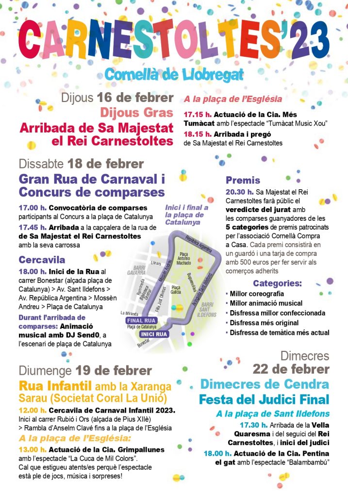 12:00 h: Inicio del recorrido de la rúa de Carnaval Infantil con el siguiente itinerario: calle Rubió i Ors (a la altura del Pius XIIè), pujada de la Rambla d’Anselm Clavé, y finalización en la Plaza de l’Església.