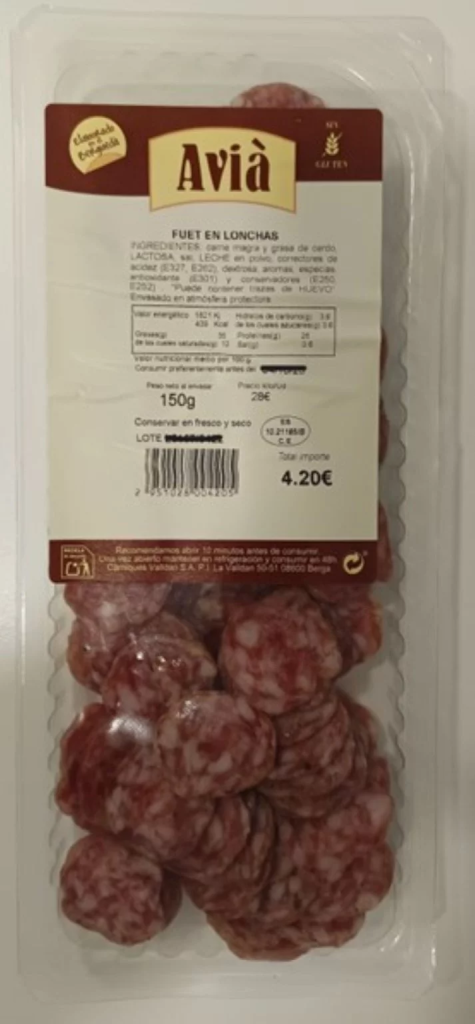 | La Agencia Española de Seguridad Alimentaria y Nutrición (AESAN) amplía la información relativa a la alerta por presencia de Salmonella en fuet loncheado de las marcas La Tabla y VALLDAN. Se incluye en la alerta el producto fuet loncheado de la marca AVIÀ de 150 gr, lote L5141. Así mismo, se modifica la imagen disponible del producto de la marca VALLDAN afectado. Se recomienda a las personas que tengan en su domicilio los productos incluidos en esta alerta se abstengan de consumirlos. |