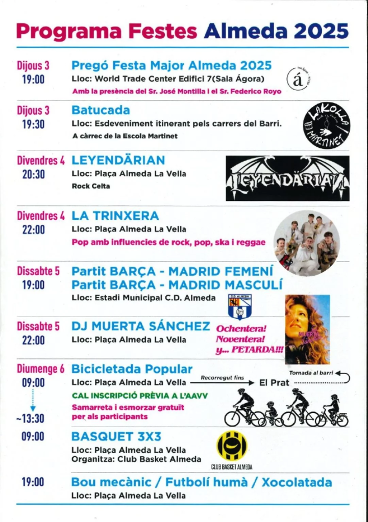 Durante todos los días de la fiesta, hay actividades interesantes programadas, como partidos de fútbol (el sábado 5, a las 19 h, en el Estadio Municipal CD Almeda), una bicicletada popular y un 3X3 de baloncesto (el domingo 6, de 9 a 13.30 h, en la plaza de Almeda la Vella), un 18 en la plaza de Almeda la Vella) y un campeonato de dominó, ajedrez y ping pong (el mismo día, a las 18 h, en la sede de la Asociación de Vecinos).
