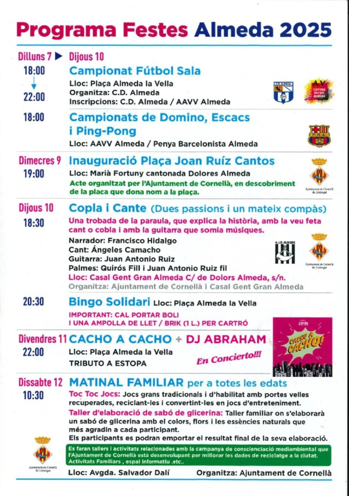 Habrá más actividades importantes, como el bingo solidario en la plaza de Almeda la Vella (el jueves 10, a las 20.30 h, y hay que llevar un brik de leche para participar), una matinal de actividades familiares (el sábado 12, a las 10.30 h, en la avenida de Salvador Dalí), una fiesta de Almeda la Vella, a las 18.30 h) y correfocs, para cerrar la celebración (el domingo 13, a las 22 h, en la plaza de Almeda la Vella).