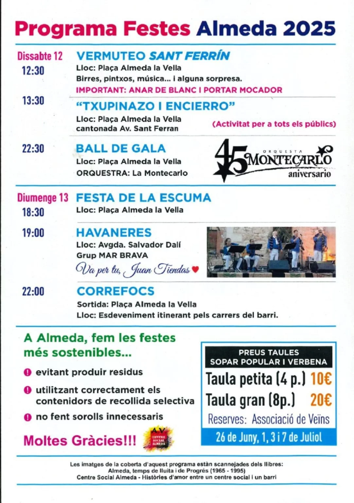 Evidentemente, la música también será protagonista, con la sesión de la DJ Muerta Sánchez (sábado 5, a las 22 h, en la plaza de Almeda la Vella) una sesión de Copla y Cante (jueves 10, a las 18.30 h, en el casal de la Gent Gran Almeda) y el concierto y tributo en Estopa las 22 h, en la plaza de Almeda la Vella). También habrá ‘Vermuteo’, el sábado 12, a las 12.30 h, en la plaza de Almeda la Vella, baile de gala (el sábado 12, a las 22.30 h, en la plaza de Almeda la Vella con la orquesta Montecarlo) y habaneras (el domingo 13, de las 1.00 horas).
